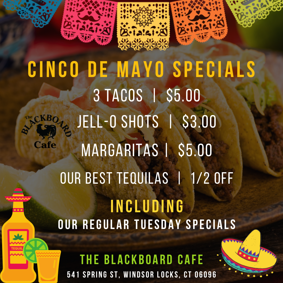 CINCO DE MAYO SPECIALS: 3 Tacos for $5, $3 Jell-O Shots, $5 Margaritas, and 1/2 off our best tequilas. #cincodemayo