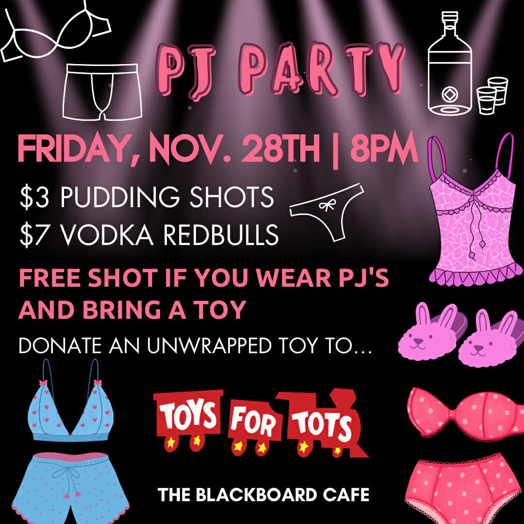Join us on Friday, November 28th at 8PM for our PJ Party. $3 Pudding Shots and $7 Vodka Redbulls. FREE SHOT if you wear pj’s and bring a toy. Donate an unwrapped toy to Toys for Tots. https://facebook.com/events/s/pj-party/1379772566822074/ #pjparty #toysfortots #theblackboardcafe